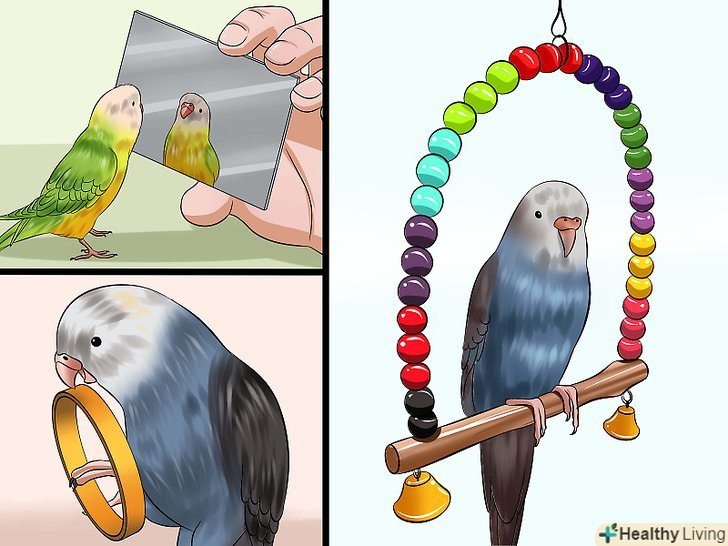 Забезпечте папужці здорове і щасливе життя за допомогою іграшок. хвилястим папужкам подобається, коли у них є різноманітні іграшки. З їх допомогою можна ще сильніше зміцнити дружні відносини з птахом. Постарайтеся регулярно міняти одні іграшки на інші (як мінімум, один раз на місяць), щоб папужка був задоволений. [18] до хороших іграшок для хвилястих папуг, які зазвичай завжди є в зоомагазинах, відносять: [19]- Сходи;