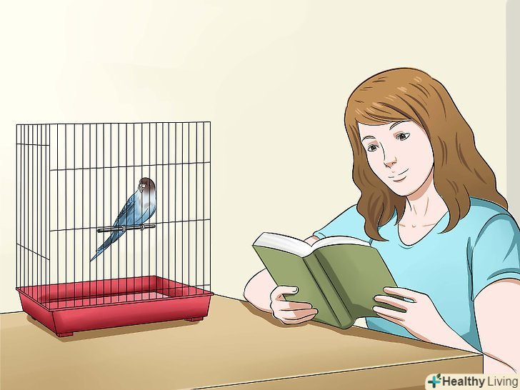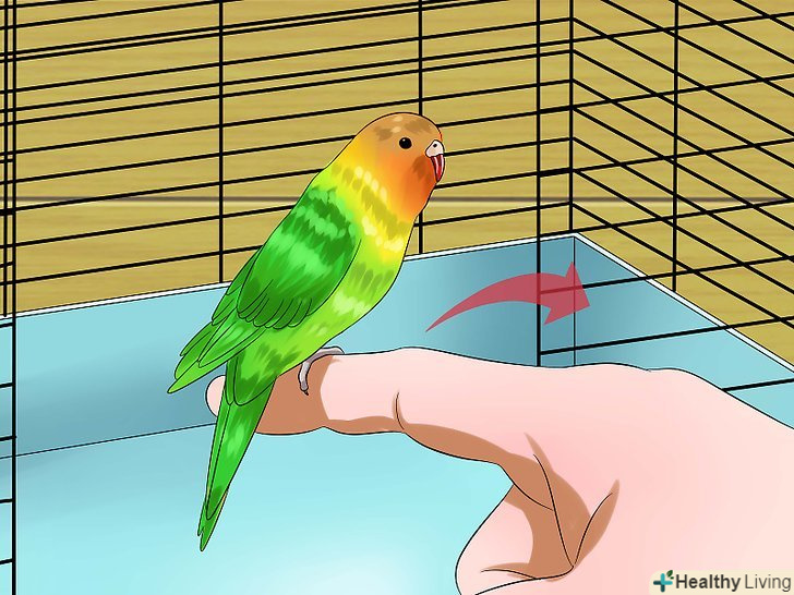 - Поки папуга тільки звикає до того, що його виймають з клітки, не варто переміщатися з ним по кімнаті занадто багато. Заняття з птахом повинні бути короткими. [15]