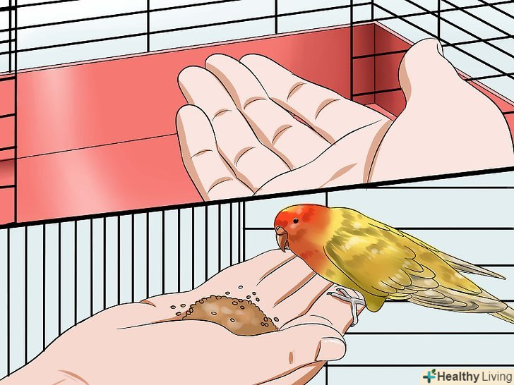 - Коли ви даєте папужці корм і міняєте йому воду, Ласкаво розмовляйте з ним, щоб у птиці розвивалася позитивна асоціативний зв'язок з вами. Також можна класти на клітку або в клітку спеціальні частування для папужки. [4]