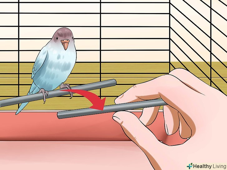 Навчіть папужки застрибувати на паличку. як тільки хвилястий папужка почне довіряти вам настільки, що буде брати їжу у вас з рук, його можна буде привчити встрибувати на жердинку або на паличку. Відкрийте дверцята клітки і обережно просуньте всередину паличку. Дуже акуратно притисніть паличку до живота птиці. Через деякий час вона навчиться пересідати на цю паличку. [11]- На даному етапі дозвольте птиці тільки пересідати на паличку і залишатися в клітці. Не намагайтеся вийняти її з клітки. Хвилястому папужці все ще потрібен деякий час, щоб звикнути до вас.