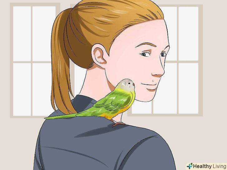 Дозвольте вихованцеві сидіти у вас на плечі. коли папужка стане спокійно ставитися до того, що його виймають з клітки, можна спробувати пересаджувати його до себе на плече. Багатьох папужок можна успішно привчити сидіти на плечі господаря. [17]