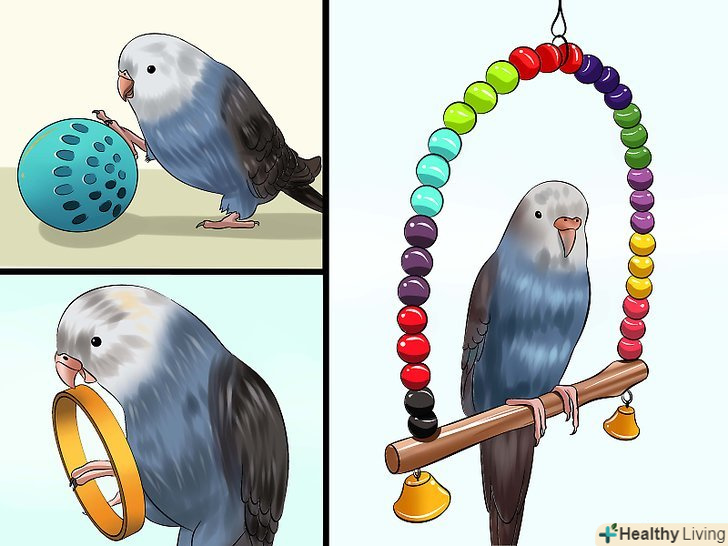 Забезпечте хвилястого папугу іграшками. хвилясті папуги люблять грати, тому вихованець буде щасливий і задоволений, якщо ви забезпечите його цікавими і стимулюючими іграшками.- У папуги повинні бути такі іграшки, за якими він зможе лазити, а також просто яскраві і видають звуки іграшки. [18]
