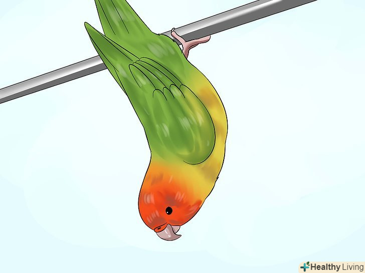Зверніть увагу на повисання птиці вниз головою. цей прийом досить поширений серед птахів. Зазвичай Птахи повисають вниз головою тоді, коли вони всім задоволені і відчувають себе в цілковитій безпеці, так як така поза робить їх досить вразливими. Якщо ваш папуга повис вниз головою у вашій присутності, то ви йому подобаєтеся і він вам довіряє. [9]