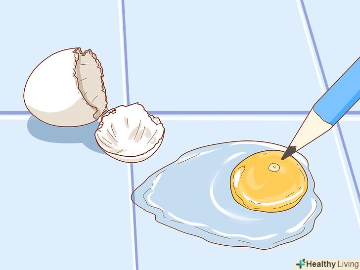Розбийте шкаралупу, щоб перевірити яйце на фертильність. найточніший спосіб визначити фертильність яйця на ранній стадії розвитку — розбити його. Коли розіб'єте яйце, шукайте бластодиск, щоб подивитися, чи перетворився він на бластодерму. Очевидно, що якщо ви скористаєтеся цим способом, ви не зможете виростити курчати. Якщо ви розбиваєте яйця, щоб приготувати їжу, то різниці в смаку між фертильними і нефертильними яйцями не буде.- У запліднених яйцях буде бластодерма, яка схожа на білий кружок або овал. Бластодерма білого кольору досить непрозора, краї рівні і чіткі. Цю щільну точку оточує більш прозорий зовнішній шар.
