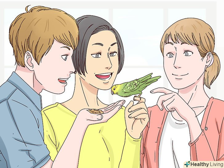 Поступово знайомте папужки з іншими мешканцями будинку. папужка може бути приголомшений, якщо навколо нього стане товпитися багато людей. Знайомте з ним членів своєї сім'ї по одному і просите кликати папужки на ім'я. Щоб ваші домочадці могли завоювати довіру папужки, попросіть і їх годувати його.- Будьте обережні, якщо у вас є інші домашні тварини, особливо кішки. Кішки є хижаками і можуть вважати вашого папужки підходящої для себе їжею. Тримайте кішку в іншій кімнаті, щоб не піддавати папужки стресу. Собаки також можуть збуджуватися при вигляді папужки. Їх гавкіт може налякати птицю.