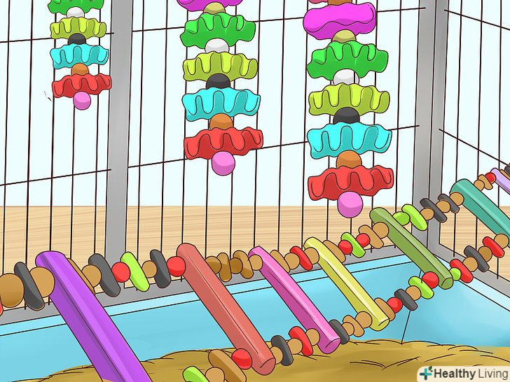 Додайте в клітку кілька жердинок різної товщини, форми і текстури. відмінно використовувати жердочки з натуральних гілок, особливо в порівнянні з жердочками з пластику або обробленої деревини. Вони виглядають набагато краще. Переконайтеся в тому, що жердочки надійно закріплені, щоб уникнути можливих травм. [1]- Існує велика різноманітність іграшок. Зверніть увагу на сходи, дзвіночки, кульки і так далі. Вони послужать джерелом розваг для вашого папужки.