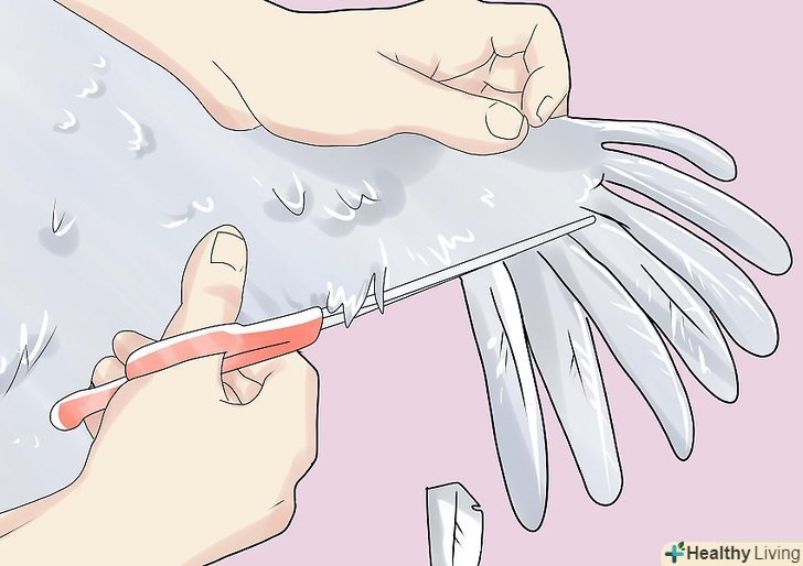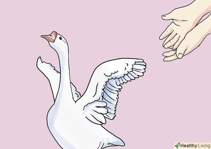 Подрежьте їм крила. ви заощадите багато часу якщо зробите це до того, як випустите їх з клітки. Це робота 2-3 чоловік. Акуратно візьміть гусака за шию (не дайте йому вщипнути себе за обличчя), а тіло міцно, не стискаючи, тримайте ближче до себе. Самці дуже сильні, так що будьте готові. Нехай одна людина візьме крило, розправить його і підріже найкоротші пір'я в основі крила. Не перестарайтеся і будьте гранично обережними, тому що тварина буде боротися, поки ви будете робити це. Ви ж не хочете його поранити; якщо ви пораните гусака, він може померти.