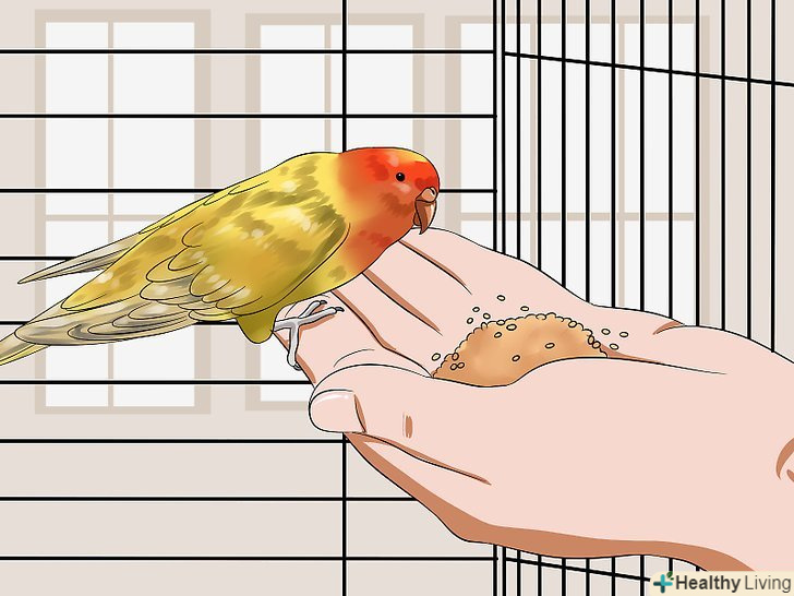 - Пропонуйте птиці частування з руки по 3-5 разів на день, [21] а також тоді, коли насипаєте їй корм і міняєте воду. Зрештою, птах почне з нетерпінням чекати від вас чергового частування. [22]