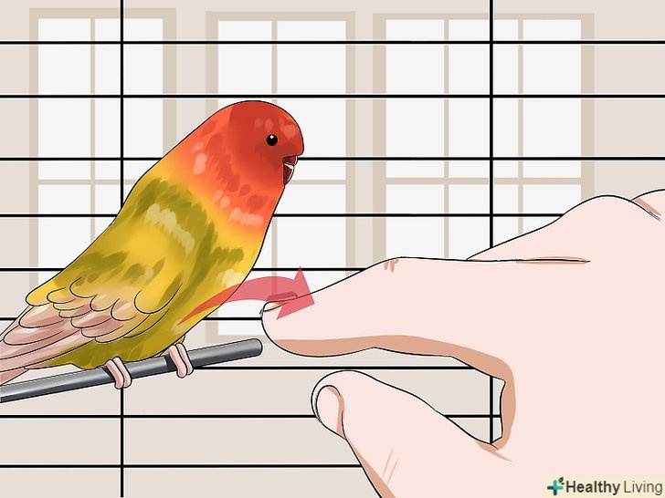 Спонукайте птицю сісти на ваш палець. розташувавши палець під грудьми птиці, злегка штовхніть її, щоб спонукати вихованця пересісти на ваш палець. [28] не дивуйтеся, якщо птах отпригнет або перелетить в інший кінець клітини. В такому випадку не переслідуйте її, а просто приберіть руку і повторіть спробу трохи пізніше. Також можна залишити руку в клітці і дочекатися того моменту, коли птах знову заспокоїться і буде готова до другої спроби. [29]- Якщо птиці потрібен додатковий стимул, спробуйте взяти у вільну руку частування. Тримайте його таким чином, щоб птиці довелося застрибнути до вас на палець, щоб дістатися до частування. [30] даний крок виконаємо тільки в тому випадку, коли дверцята клітини досить широка, щоб в неї можна було просунути відразу дві руки.
