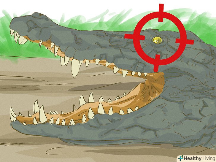 Атакуйте очі крокодила. очі є найбільш вразливою частиною тіла крокодила, і деякі врятувалися після нападу крокодилів люди повідомляли, що їх виручив саме цей прийом. Постарайтеся натиснути на очі тварини, штовхнути їх, вдарити кулаком або чимось ще, що виявиться у вас під рукою. Не припиняйте бити по очах-саме в цьому полягають ваші шанси на порятунок. [17]