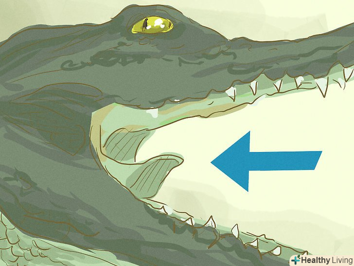 Нанесіть удар по піднебінному клапану, який розташований за мовою тварини. позаду мови крокодилів знаходиться піднебінний клапан, який прикриває горло, коли Рептилії занурюються у воду. Цей клапан не дозволяє воді потрапити горло, і крокодил не ковтає воду, коли відкриває пащу. Якщо крокодил затягнув вас під воду, постарайтеся вхопитися за цей клапан — можливо, це ваш єдиний шанс. Якщо вам вдасться схопитися за клапан, вода потрапить крокодилу в горло, і йому доведеться відпустити вас.- Сильні удари по піднебінному клапану також можуть змусити рептилію відпустити вас.