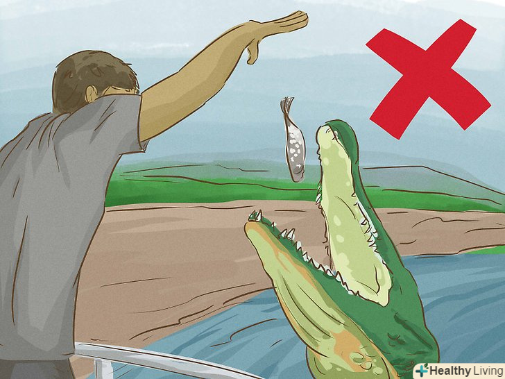 Не годуйте крокодилів або алігаторів. під час годування ці рептилії втрачають свою природну обережність по відношенню до людей і починають асоціювати їх з їжею. Ніколи не годуйте крокодилів навмисно і намагайтеся не робити цього випадково: наприклад, не викидайте у воду залишки риби та інші харчові відходи. [11]- Не слід годувати навіть маленьких крокодилів. Пам'ятайте, що п'ятдесятисантиметровий крокодил з часом може вирости в триметрового монстра, у якого їжа як і раніше буде асоціюватися з людьми. Це небезпечно як для самої тварини, так і людей, які можуть зустрітися йому.
