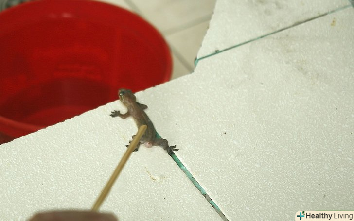 Повільно і дуже обережно доторкніться палицею до її спини / хвоста і направте її до відра. Будьте дуже обережні, щоб не поранити її або не ткнути занадто сильно - просто відразу ж підштовхніть її в потрібному напрямку. Після того як зловите ящірку, перенесіть її в підходящої для рептилій будиночок, якщо він у вас є. Якщо у вас немає будиночка, то переконайтеся, що відро досить високе або пересадите її в таке відро. Або зробіть імпровізований, тимчасовий будиночок з взуттєвої або будь-який інший коробки.