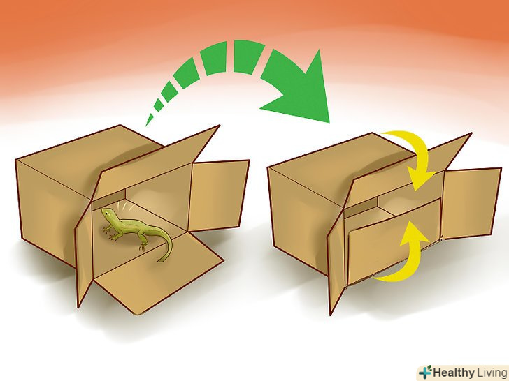 Просуньте шматок картону або паперу під коробку. як тільки ящірка виявиться в ємності, можна її там замкнути. Просуньте папір або картонку під отвір коробки, щоб повністю її закрити. Тримайте ящірку всередині, поки або не випустите її на волю, або не повернете в клітку. [9]