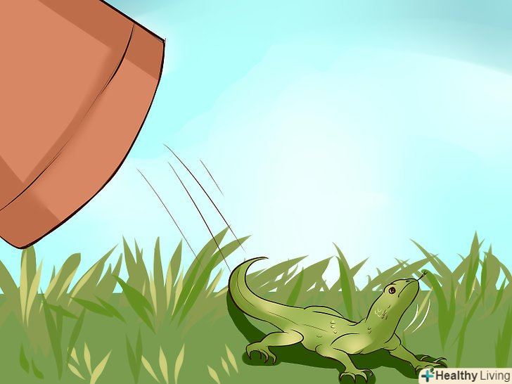 Приберіть картон. утримуючи коробку близько до землі, приберіть картон або папір. Ящірка повинна вискочити назовні. Якщо цього не станеться, відійдіть або залиште контейнер на кілька хвилин. Швидше за все, ящірка піде, коли підете ви. [11]- Крім того, можна обережно перекинути контейнер (за умови, що він буде знаходитися близько до землі), щоб ящірка випала з нього.