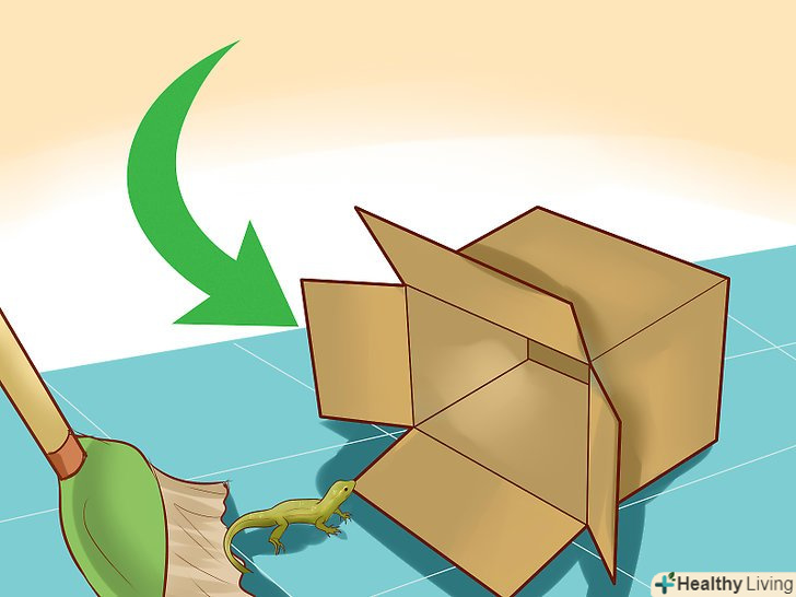 Переслідуйте ящірку, поки вона не опиниться в коробці. якщо ящірка сидить на стіні, використовуйте журнал або аркуш паперу, щоб підштовхнути її до коробки. Якщо вона лежить на підлозі, використовуйте віник або лінійку. Швидше за все, ящірка забіжить в контейнер, вирішивши, що там безпечно. [7]- Намагайтеся не торкатися ящірки. Підсуньте коробку до ящірки, щоб спонукати в ній бажання забігти всередину, але не чіпайте саму рептилію.