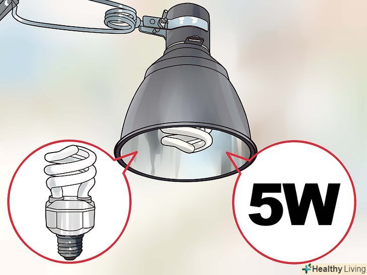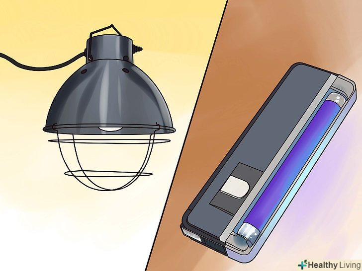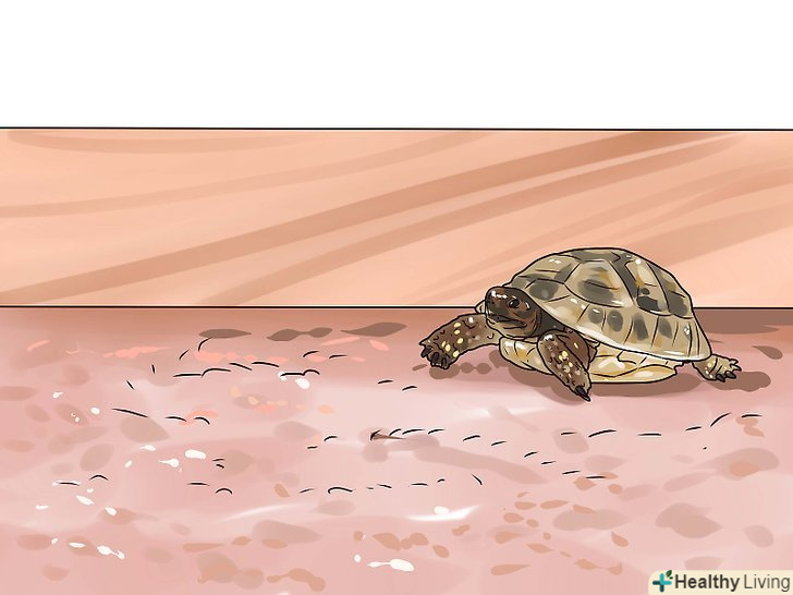 Забезпечте денне освітлення вольєра. якщо ви утримуєте черепаху будинку без прямого сонячного освітлення, забезпечте у вольєрі підсвічування ультрафіолетовою лампою спектра B (або UVB) потужністю не менше 5 Вт. Встановіть лампу по центру вольєра, щоб вона висвітлювала весь його простір. Використовуйте підсвічування по 8-12 годин на день.- Черепахи люблять спеку, але вони погано справляються з температурою, помітно перевищує 26,5 °C. Якщо через підсвічування у вольєрі стає занадто жарко, змініть розташування лампи. Підвісьте її вище над вольєром. [6]
