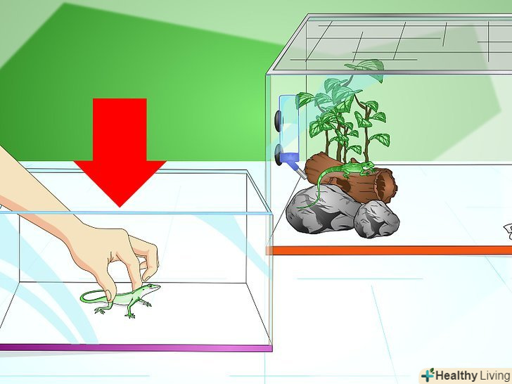 Чистіть клітку. необхідно чистити житло ящірки раз на тиждень. Крім цього, слід перевіряти клітку кожен день, видаляючи з неї пролиту воду, залишки їжі, скинуту шкуру і екскременти. Слід також чистити і оновлювати ємності з їжею і водою. [46]- Під час щотижневого очищення клітини помістіть ящірку в іншу чисту клітку або контейнер. [47]