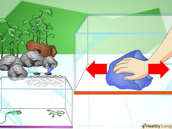 - Продезінфікуйте клітину. Можна використовувати спеціальний засіб для очищення клітин рептилій, але після нього слід ретельно промити клітку водою. [51]