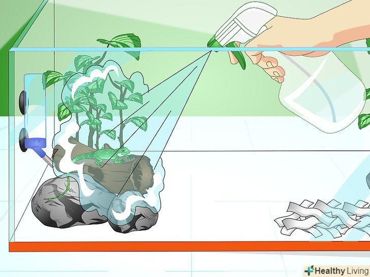 Обприскуйте ящірку водою. деякі види необхідно обприскувати раз в день. Користуйтеся пляшкою з розпилювачем, використовуючи режим розпилення, а не струменя. Тим самим ви створите необхідну вологість. [27]- Наприклад, ігуанам необхідно зволоження, в той час як бородаті агами обходяться без нього. [28]
