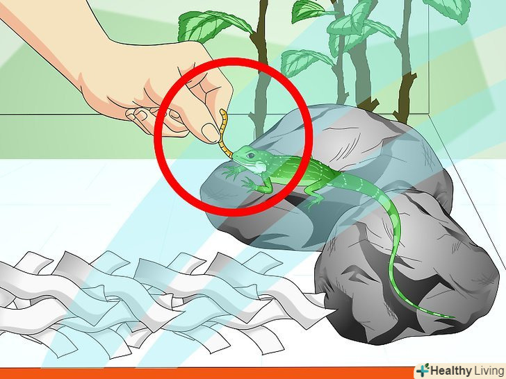 - Шматочки їжі повинні бути досить дрібними, щоб ящірка не вдавилася. Крім того, слід поміщати їжу на маленьке блюдце, особливо в тому випадку, якщо на підлозі клітини пісок. [40]