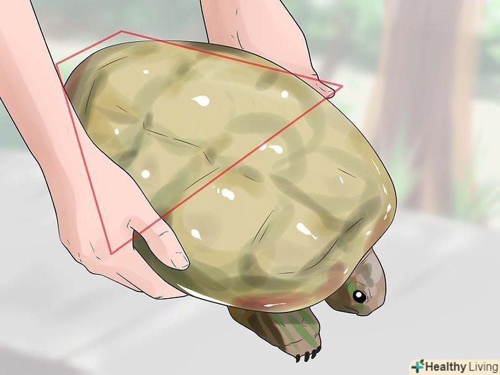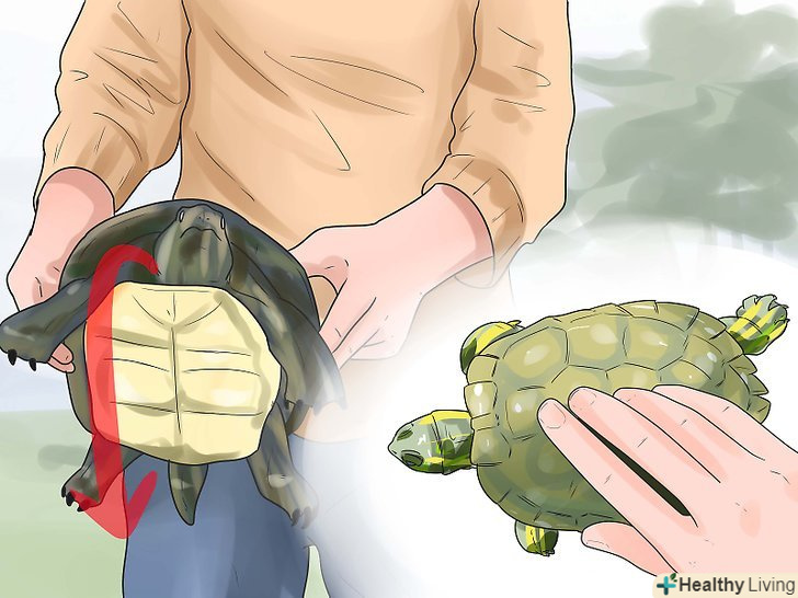 Обережно поводьтеся з черепахою. завдяки своєму панциру черепахи здаються міцними і витривалими. Проте, їх лапи і голову легко травмувати при неправильному поводженні. Нижче наведено ряд корисних порад для обережного поводження з такою твариною.- Постарайтеся не брати черепаху в руки і не піднімати її в повітря без особливої необхідності. Коли невелику черепаху все ж потрібно підняти, підводите долоню під пластрон (нижню половину панцира) і стежте за тим, щоб лапи вихованця могли спертися на вашу руку. У дикій природі черепахи не часто відриваються від землі (якщо взагалі таке трапляється). Тому наявність твердої опори у вигляді вашої долоні буде забезпечувати вихованцеві більший комфорт. [12]