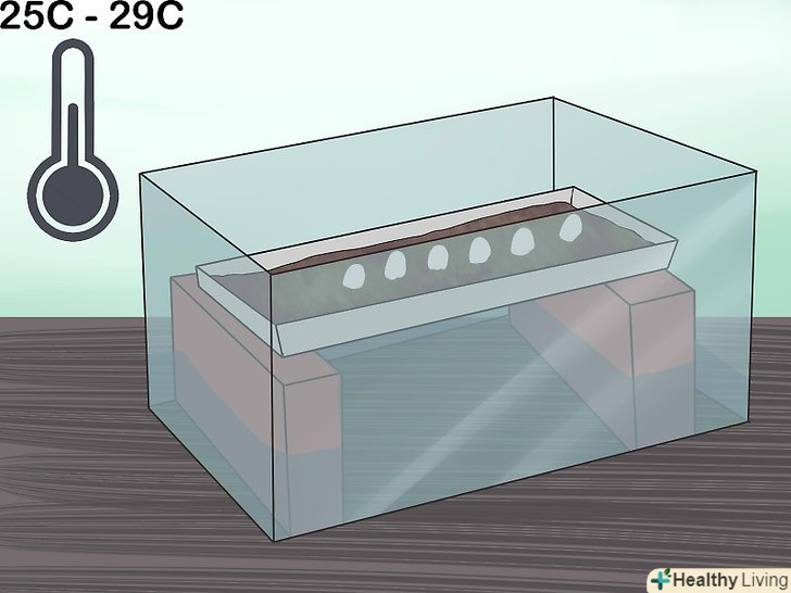 Придбайте інкубатор. інкубатори використовують для того, щоб регулювати температуру яєць, з яких повинні вилупитися тварини. Інкубатор повинен мати хорошу теплоізоляцію, щоб підтримувати постійну температуру, і мати прозорі стінки або іншу можливість спостерігати за яйцями. Інкубатор можна придбати в зоомагазині, магазині товарів для сільського господарства, або замовити через Інтернет. [2]- Інкубатор повинен бути досить великим, щоб в ньому помістився контейнер з яйцями. Виміряйте контейнер, перш ніж купувати інкубатор.