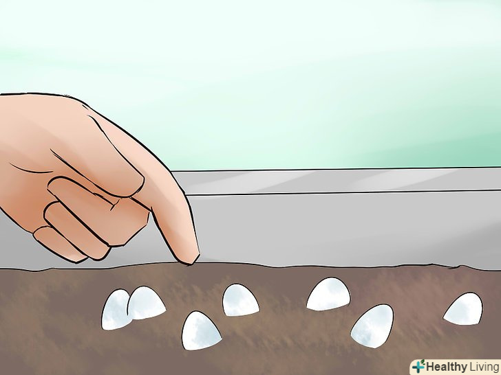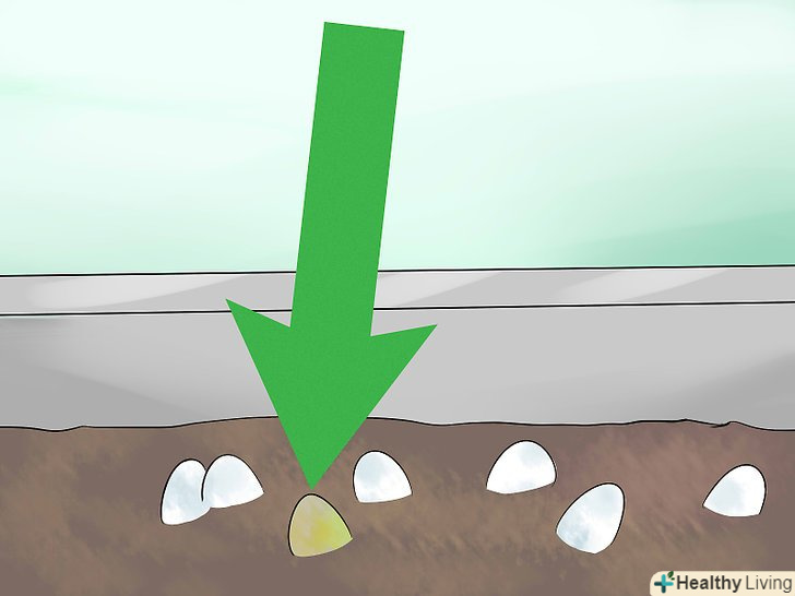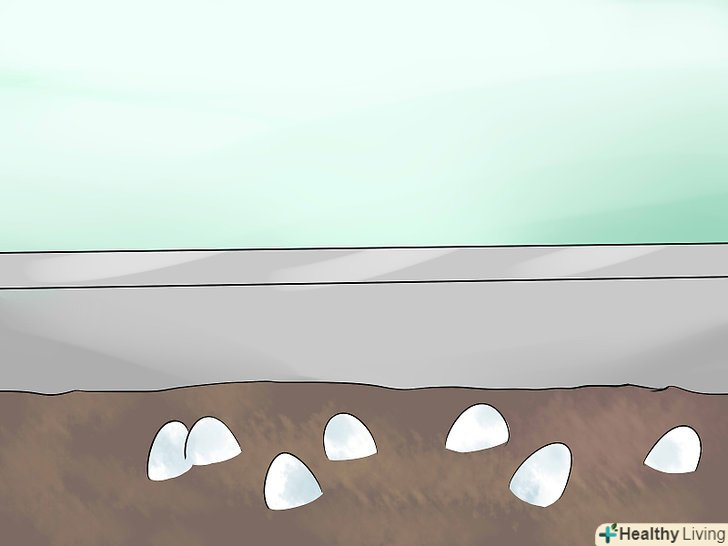 Пальцем видавіть в грунті місця для яєць. видавіть в грунті ямку в тому місці, куди ви хочете помістити яйце. Це необхідно для того, щоб яйце не перекотилося і не пошкодило тим самим ембріон. Крім того, так ви зможете трохи занурити яйце в грунт. Яйця повинні бути приблизно наполовину занурені в грунт. [9]- Якщо ви кладете кілька яєць, покладіть їх так, щоб між ними була відстань приблизно з товщину пальця. Розмістіть поглиблення для яєць уздовж прямої лінії.