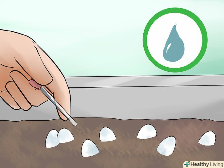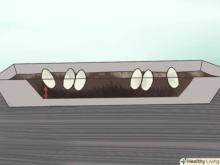 Слідкуйте, щоб грунт залишався вологим. слід засипати дно контейнера обраним матеріалом і помістити в нього яйця. Насипте матеріал так, щоб він покривав дно контейнера на 25-50 міліметрів. При виведенні яєць необхідно стежити, щоб матеріал грунту залишався вологим. Додайте воду так, щоб частинки грунту злегка злиплися. Не наливайте занадто багато води, щоб вона не виступала з грунту при натисканні на нього. [8]- Підтримуйте таку вологість грунту протягом усього періоду інкубації.