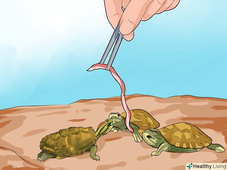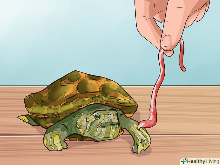 Годуйте вихованця живим кормом. на відміну від сухопутних черепах, Морські черепахи також їдять і м'ясо. Це важлива складова їх раціону, так що обов'язково постачайте свою черепаху їжею тваринного походження, включаючи живий корм. Наприклад, морську черепаху можна годувати цвіркунами, личинками мучного хрущака і воскової молі, а також іншими невеликими личинками і комахами. [1] якщо у вас прісноводна черепаха, її також потрібно буде годувати маленькими рибками, наприклад кометою, звичайною гамбузією або навіть прісноводними равликами. [2]- Живих і мертвих черв'яків і цвіркунів можна купити в найближчому зоомагазині.