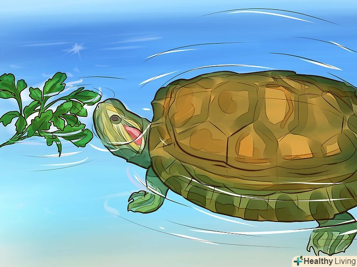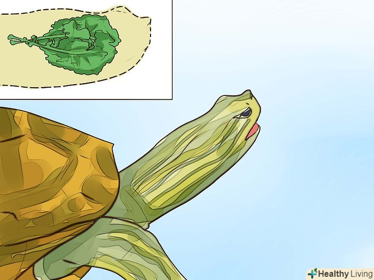 Годуйте фруктами і овочами. у черепах різноманітна дієта, що включає фрукти і овочі, а також м'ясо. Як правило, молоді черепахи їдять більше м'яса, а з віком починають їсти більше фруктів і овочів. Із загальної кількості фруктів і овочів, які отримує черепаха, приблизно 80-90% повинні складати овочі і квіти, і лише 10-20 % — фрукти. Як правило, основну частину раціону черепахи складають зелень і зеленолисті овочі, тоді як овочів з високим вмістом клітковини на зразок салату-латук і селери краще уникати.- Найкраще для раціону черепахи підходять кучерява капуста, петрушка, зелена квасоля, болгарський перець і капуста.
