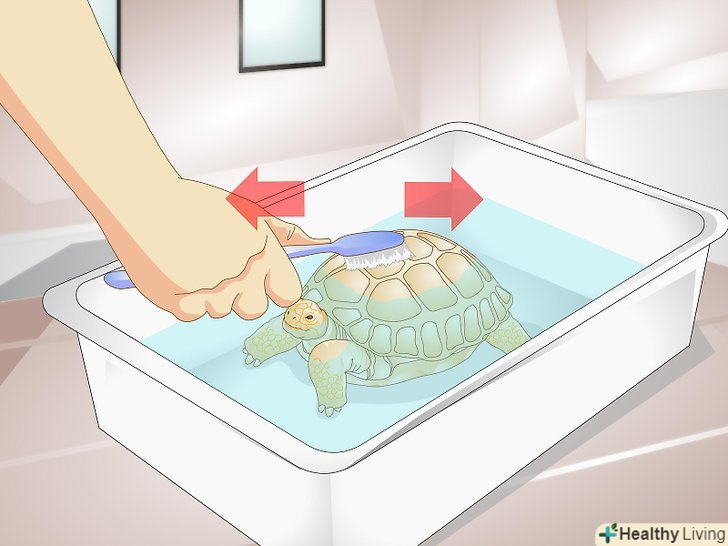 Змийте бруд. змийте бруд, яку тільки що зчистили зубною щіткою, акуратно поливаючи черепаху зверху.- Поки чистите черепаху, огляньте її і переконайтеся, що на шкірі немає ніяких ран або тріщин, а на панцирі — пошкоджень. Якщо ви помітили щось незвичайне, можливо, варто показати черепаху ветеринару. [13]