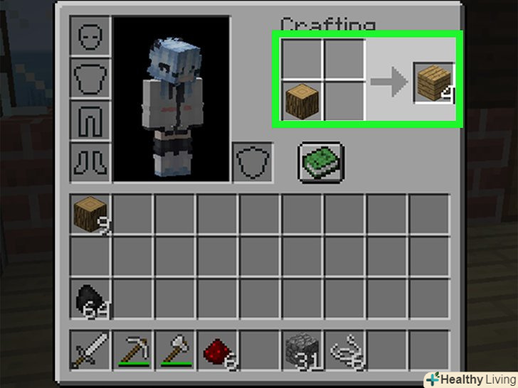 Скрафтіть дошки. натисніть E, щоб відкрити інвентар, а потім перетягніть один дерев'яний блок в будь слот сітки крафта інвентарю. Будуть створені чотири дерев'яні дошки; перетягніть їх у свій інвентар.