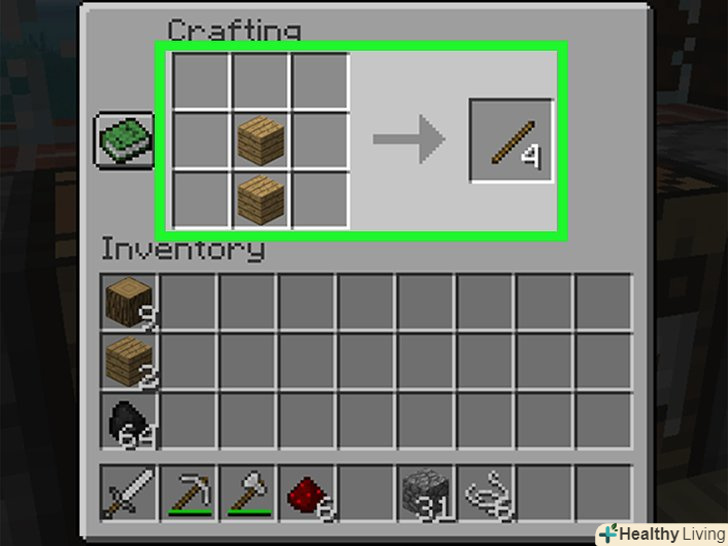 Скрафтіть палиці.для цього додайте одну дошку в нижній середній слот і одну дошку в центральний слот верстата. Будуть зроблені чотири палиці; перетягніть їх у свій інвентар.