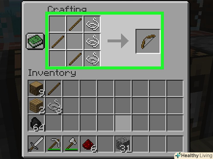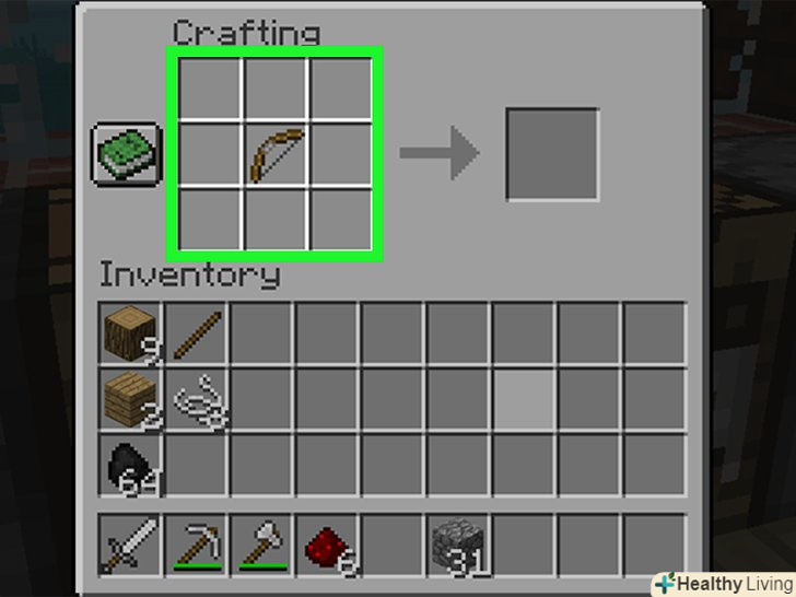 Скрафтіть цибулю.для цього знадобляться три палиці і три нитки. Додайте ці предмети в слоти верстата наступним чином:- Палиці - по одній палиці додайте в нижній середній, лівий середній і верхній середній слоти.
