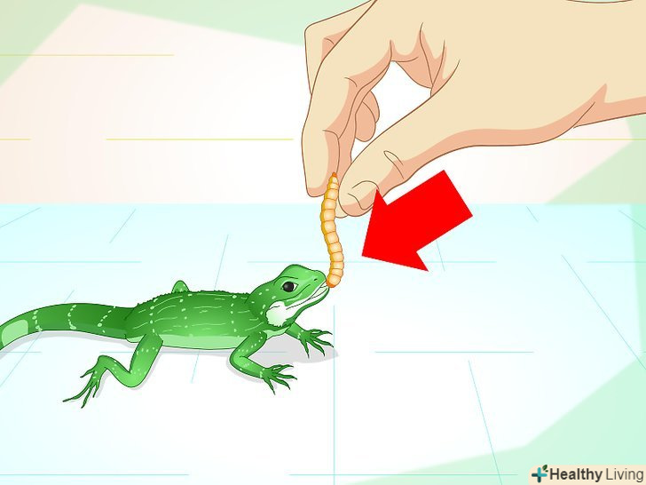 Забезпечте агаме правильне харчування. раціон тварини повинен забезпечувати його необхідними поживними речовинами і відповідати тому, що воно їсть в дикій природі. Раціон водяної агами складається головним чином з різних комах, а також деякої кількості овочів і фруктів. При такому харчуванні ваш вихованець залишиться здоровим і повним сил. [2]- Основну частину раціону водяної агами складають цвіркуни і борошняні черв'яки. Однак така їжа містить мало кальцію, тому безпосередньо перед годуванням слід посипати комах кальцієвим порошком. Це допоможе заповнити недолік кальцію і зміцнити кістки тварини.