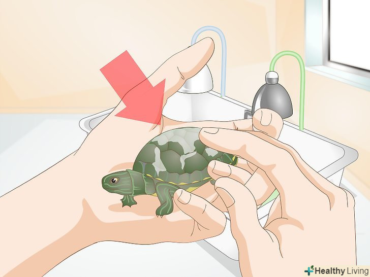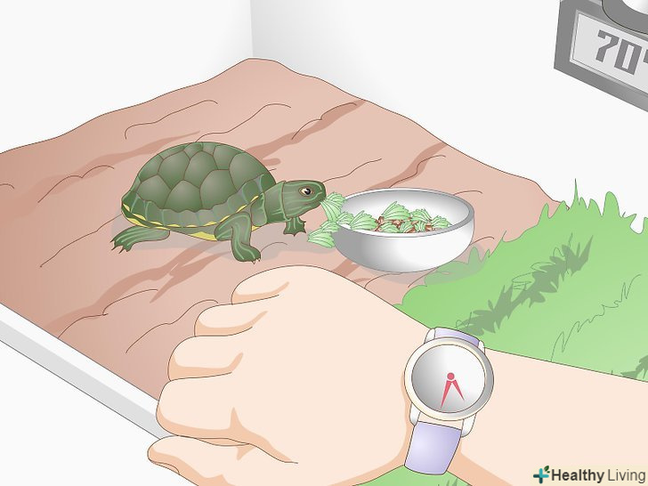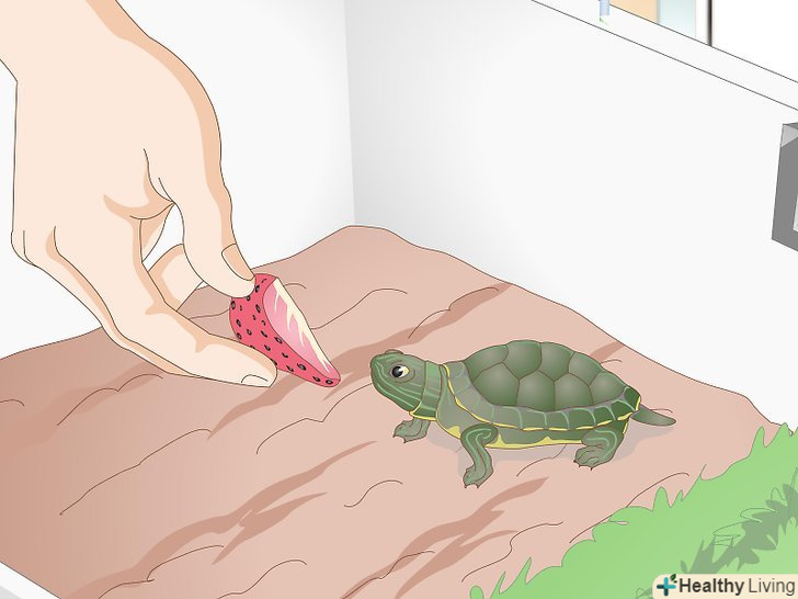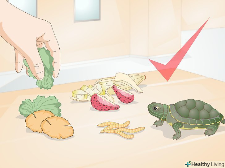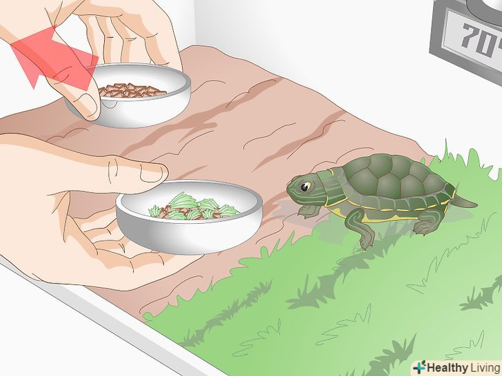 Забезпечте черепасі збалансоване харчування. раціон черепахи повинен складатися з фруктів, овочів і м'яса. Якщо черепаха водоплавна, 65-90% її раціону має припадати на тваринну їжу (черви, равлики, молюски, заморожені новонароджені миші, сухий корм), а 10-35% — на рослинну (зелень, терта морква, виноград, манго, диня). Якщо черепаха сухопутна, 50% раціону має становити м'ясо (цвіркуни, черв'яки, личинки, равлики) і 50% — овочі та фрукти (ягоди, горох, кабачок, квітки).- Молодим черепахам потрібно більше м'яса, ніж зрілим особинам. [19]