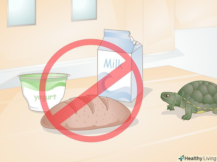Знайте, яку їжу давати не можна. Черепаха добре себе почуває, коли їсть різноманітну їжу в помірних кількостях. Однак є продукти, які черепахам давати не можна. Не давайте своєму вихованцеві наступні продукти: [23] [24]- Будь-які молочні продукти( сир, йогурт та інші);