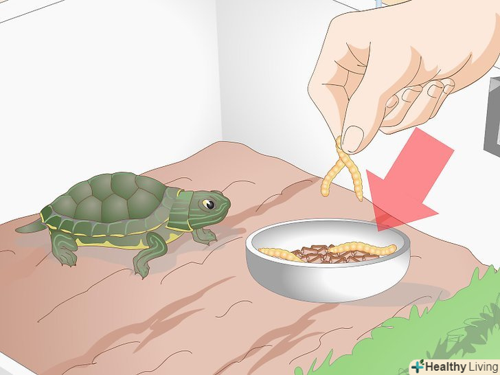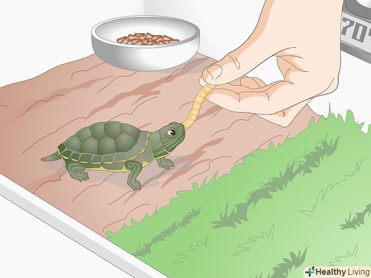 Давайте черепасі живу їжу. Черепаха реагує на рух. Вона може віддавати перевагу живу їжу: цвіркунів, черв'яків, равликів, личинок, новонароджених мишей. [10] у живої їжі також сильний запах, який може залучати черепаху. [11]- Не давайте черепасі черв'яків, знайдених у дворі. Вони можуть бути заражені хімічними речовинами з грунту. Купуйте спеціальних чистих черв'яків в зоомагазині або магазині рибальських товарів.