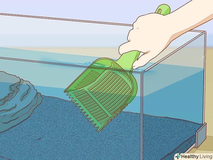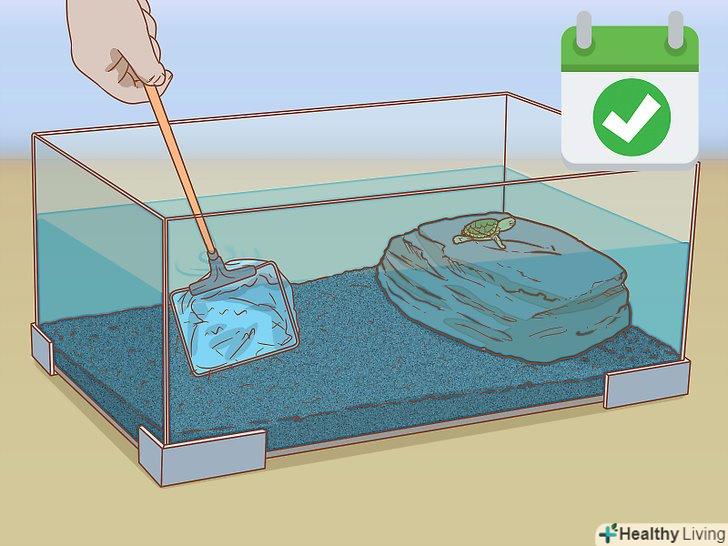 Видаляйте з акваріума екскременти і залишки їжі. водяні черепахи досить неакуратні. Під час їжі вони розкидають їжу, у них зазвичай немає певного місця для випорожнення. Необхідно щодня видаляти з акваріума фекалії і розкидані залишки їжі, особливо якщо вони потрапили в воду. Щоб не виймати черепаху з акваріума кожен день (це може бути важко і для вас, і для вашого вихованця), використовуйте совок для котячого лотка або сачок. [12]