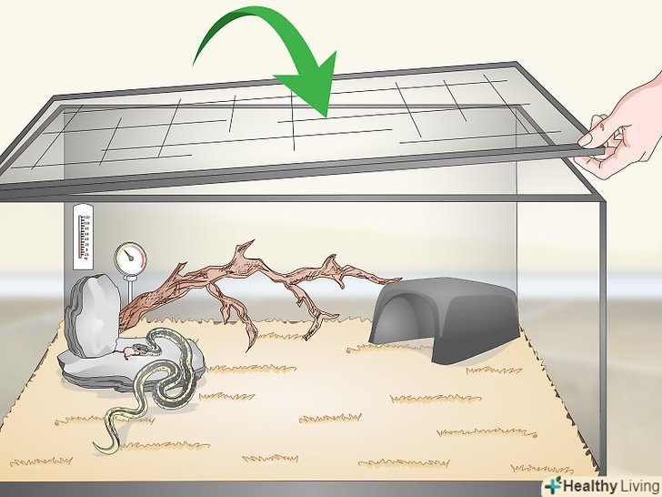 Придбайте відповідний за розмірами тераріум. тераріум являє собою скляну ємність, призначену для утримання змій та інших рептилій. Він схожий на акваріум, але його не потрібно заповнювати водою. Простежте, щоб тераріум був спеціально призначений для змій, так як вони дуже вправні втікачі і напевно вислизнуть, якщо тераріум не матиме надійної кришки. Залежно від виду змії вам може знадобитися довгий або високий тераріум. Якщо ви збираєтеся завести велику змію, вам буде потрібно більш просторий тераріум. [1]- Наприклад, якщо у вас великий удав, буде потрібно широкий тераріум об'ємом 150 літрів. Якщо ж ви збираєтеся завести дрібну деревну змію, досить буде 80-літрового тераріуму. Простежте, щоб висота тераріуму перевищувала його ширину-в цьому випадку у змії буде достатньо місця, щоб підніматися вгору по гілках.