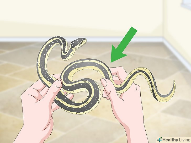 Підтримуйте змію руками під середньою 1/3 частиною її тіла. ніколи не беріть змію за голову або хвіст. Найкраще підтримувати змію під животом в середній 1/3 частини її тіла. Так буде комфортніше для самої змії, і ви легше зможете утримати її. [23]