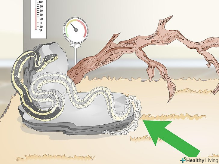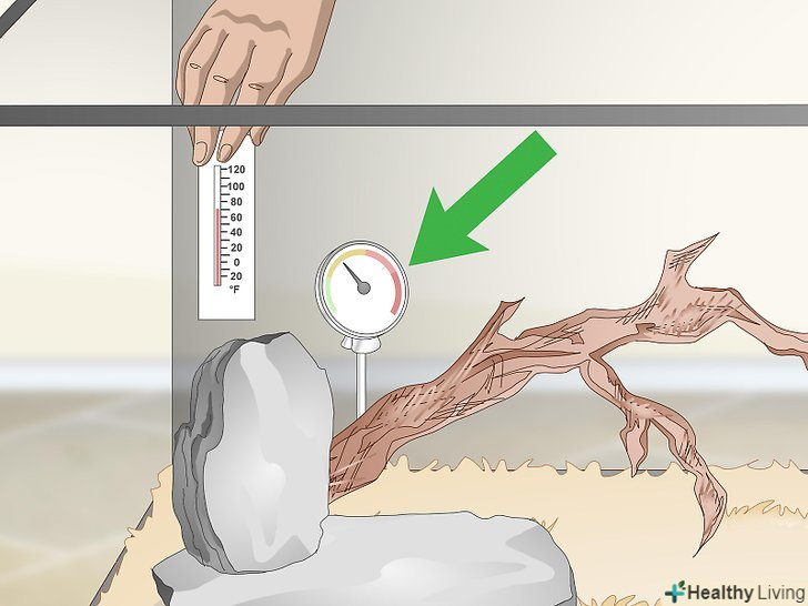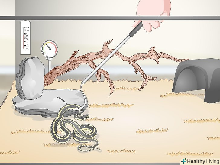 Придбайте термометр і гідрометр, щоб стежити за температурою і вологістю. різним видам змій потрібна різна температура і вологість, тому з'ясуйте, які умови найкраще підходять для вашого вихованця. Домашнього термостата недостатньо для того, щоб визначити, чи вистачає тепла вашому вихованцеві. Необхідно розмістити в тераріумі термометр і гідрометр-це дозволить вам підтримувати в ньому оптимальні умови. [13]- Якщо температура занадто низька, можливо, слід встановити ще одну нагрівальну лампу або використовувати більш потужну лампочку.