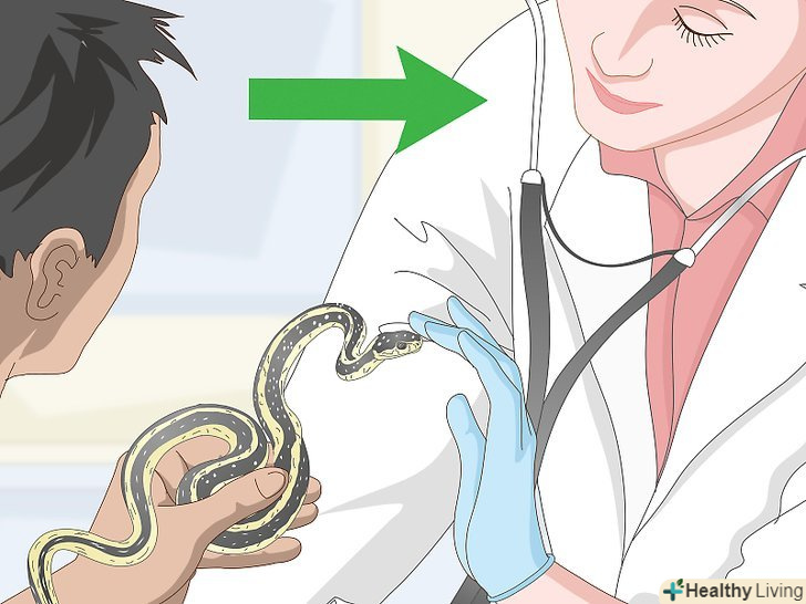 Доставте змію до ветеринара-герпетолога в разі будь-яких проблем зі здоров'ям. бажано показати змію герпетолога після її придбання, щоб переконатися, що вона здорова, і докладніше дізнатися про те, як правильно доглядати за даним видом. Якщо ви підозрюєте, що ваш вихованець захворів, найкраще доставити його до ветеринара-герпетолога. Поширеними ознаками хвороби змій є такі симптоми: [29]- Млявість і прагнення сховатися або заритися в підстилку;