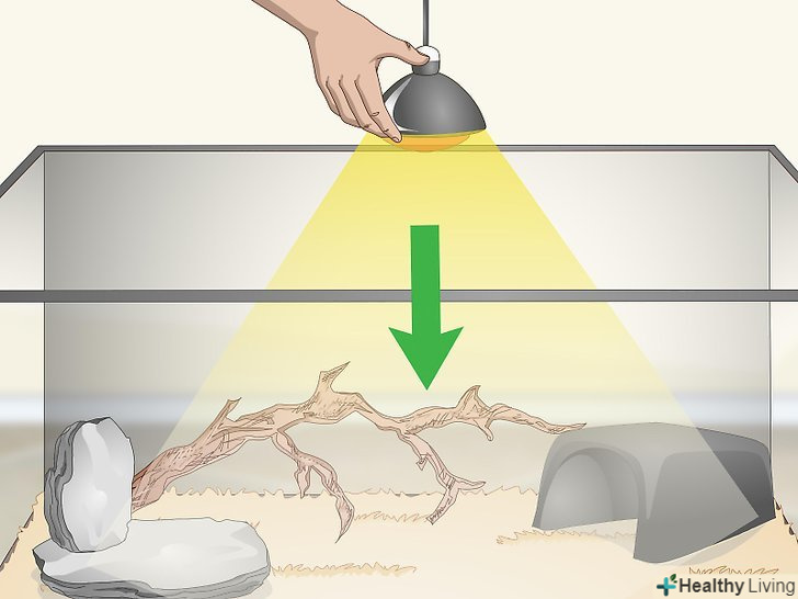 Встановіть нагрівальну лампу. Змії належать до холоднокровних тварин, тому їм потрібно хоча б одна нагрівальна лампа, щоб вони не мерзли. Нагрівальні лампи для рептилій та інші пристосування можна придбати в більшості зоомагазинів. Вони спеціально призначені для того, щоб прикріпити їх до стінок тераріуму або встановити всередині нього. [12]- Лампи розжарювання дадуть змії тепло і світло. Чим вище потужність лампи, тим більше тепла вона буде випромінювати. Для маленьких тераріумів часто вистачає однієї лампи, в той час як для більшого може знадобитися кілька ламп.