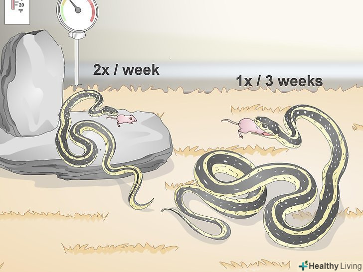 Молодих і дрібних змій слід годувати частіше, ніж їх більших родичів. молодим і дрібним зміям необхідно їсти два рази на тиждень, в той час як більших і дорослих змій досить годувати раз в 1-3 тижні. Найчастіше потрібно їсти і самкам з наближенням сезону розмноження. Якщо ви не знаєте, як часто слід годувати вашого вихованця, обов'язково проконсультуйтеся щодо цього з ветеринаром-герпетологом. [16]- Про те, як часто слід годувати змію, можна судити з її поведінки. Наприклад, якщо ваш вихованець не звертає уваги на запропоновану йому їжу, він, швидше за все, ще не зголоднів. Однак, якщо змія жадібно заковтує їжу відразу ж після того, як ви покладете її в тераріум, ймовірно, її слід годувати частіше.