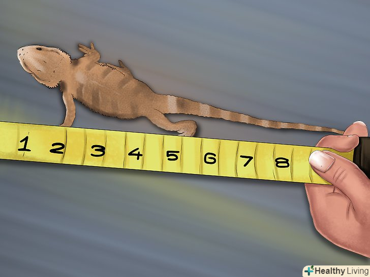 Виміряйте бородату ящірку від голови до хвоста. якщо бородата ящірка не старше одного року, її вік можна визначити приблизно, вимірявши її довжину від верхівки голови до кінчика хвоста. Обережно візьміть ящірку і за допомогою мірної стрічки виміряйте її довжину. [3]- Щоб отримати точні свідчення, виміряйте довжину ящірки, поки та спить або стоїть нерухомо. Якщо ящірка занадто рухлива і переміщається з місця на місце, Вам буде важко виміряти її довжину.