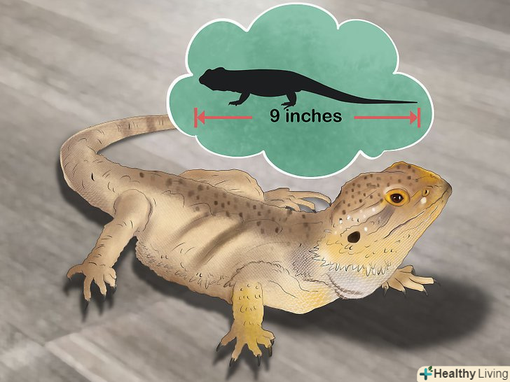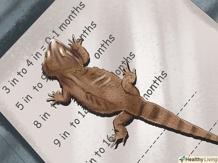 Порівняйте довжину ящірки з таблицею розмірів. Порівняйте довжину рептилії з середніми показниками розмірів бородатої ящірки в перший рік життя. Так ви дізнаєтеся приблизний вік своєї ящірки, незалежно від її статі. [4]- Від 7,6 см до 10 см = 0-1 місяць