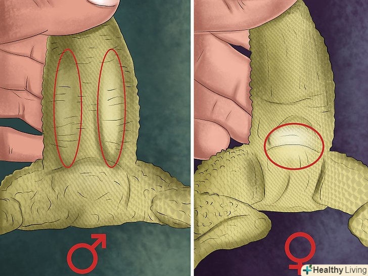 - Визначте стать ящірки, поглянувши на стегнові пори. щоб визначити стать і статеву зрілість бородатої ящірки, переверніть її на спину і погляньте на задні лапи. Якщо ви побачите великі, яскраво виражені точки, що проходять від однієї лапи до іншої, значить, у вас статевозрілий самець. Якщо ніяких точок не видно, то це самка. [7]