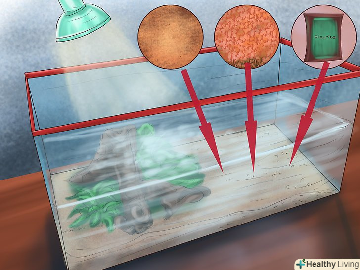Якщо ви прийняли рішення посадити живі рослини, додайте в акваріум шар субстрату. Субстратом може бути пісок, гравій або грунт на дні акваріума. Самій черепасі субстрат не потрібен, і його наявність дуже сильно ускладнить очищення акваріума. Черепасі буде цілком достатньо непрозорого дна. Однак, якщо ви збираєтеся посадити в акваріумі рослини для створення більш природної обстановки, подумайте про використання нижчезазначених субстратів. [15]- Візьміть дрібнозернистий пісок, такий як використовується в дитячих пісочницях. Він відмінно підійде для мягкопанцирних черепах, яким сподобається копатися в піску. Тим не менш, багато власників водних черепах вважають, що пісок вкрай важко підтримувати в чистоті.